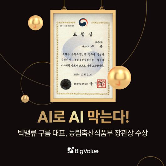 한편 구 대표는 지난해 과학기술정보통신부와 중소벤처기업부 장관 표창에 이어 이번 농림축산식품부 장관 표창을 수상하며, 빅밸류의 데이터테크 기술 역량과 공공 분야 기여도를 인정받았다.