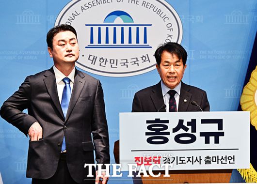 [더팩트 | 국회=배정한 기자] 윤종오 진보당 원내대표(오른쪽)가 19일 오전 서울 여의도 국회 소통관에서 홍성규 진보당 대변인의 경기도지사 출마선언에 앞서 인사말을 하고 있다.