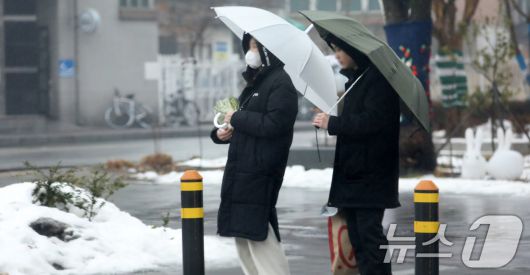 전국 대부분 지역에 눈이나 비가 내린 12일 전북자치도 전주시 백제대로에서 우산을 쓴 시민들이 발걸음을 재촉하고 있다. 2025.2.12/뉴스1 ⓒ News1 유경석 기자 |