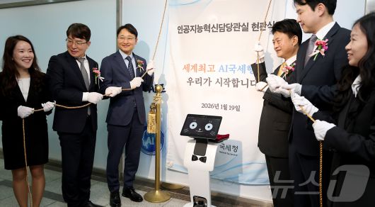 (세종=뉴스1) 김기남 기자 = 임광현 국세청장(왼쪽 두번째)이 19일 세종시 나성동 SM타워에 문을 연 AI혁신담당관실에서 로봇 카이(K-AI) 및 관계자들과 AI 국세행정을 위한 현판 제막을 하고 있다. 2026.1.19/뉴스1kinam@news1.krCopyright ⓒ 뉴스1. All rights reserved. 무단 전재 및 재배포, AI학습 이용 금지.