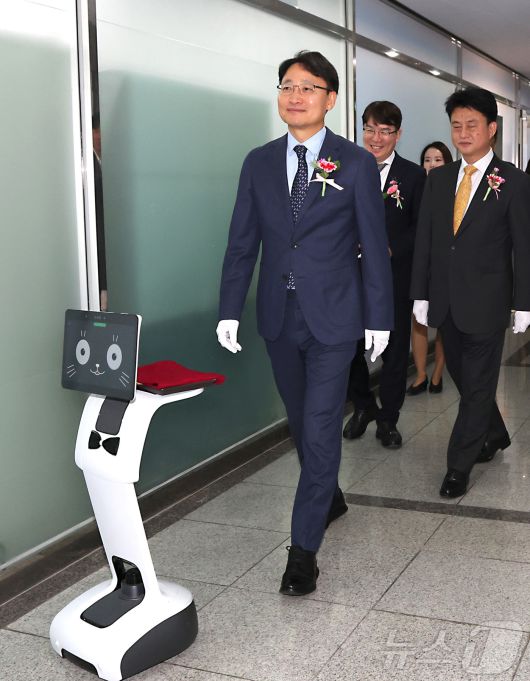 (세종=뉴스1) 김기남 기자 = 임광현 국세청장(왼쪽)이 19일 세종시 나성동 SM타워에 문을 연 AI혁신담당관실 현판식을 마친 뒤 로봇 카이(K-AI)의 안내를 받으며 사무실로 이동하고 있다. 2026.1.19/뉴스1kinam@news1.krCopyright ⓒ 뉴스1. All rights reserved. 무단 전재 및 재배포, AI학습 이용 금지.