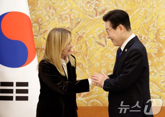 (서울=뉴스1) 이재명 기자 = 이재명 대통령과 조르자 멜로니 이탈리아 총리가 19일 청와대에서 시민보호 협력·문화유산 및 경관 보호·반도체 산업 협력 양해각서 협약식을 마친 뒤 악수하고 있다. 2026.1.19/뉴스12expulsion@news1.krCopyright ⓒ 뉴스1. All rights reserved. 무단 전재 및 재배포, AI학습 이용 금지.