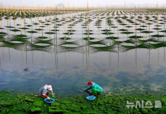 19일 장흥군에 따르면 겨울이 되면 대덕읍 매생이 양식장에는 잔잔한 바다 위로 초록빛 매생이와 어민들의 채취 작업이 어우러져 특별한 어촌 풍경이 펼쳐진다.