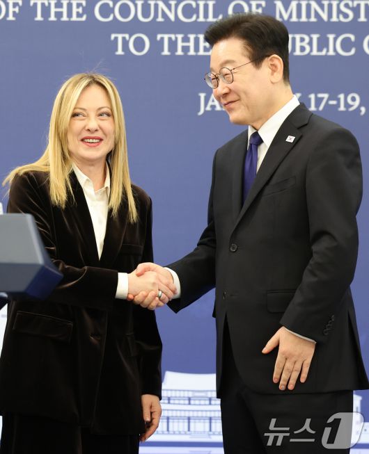 (서울=뉴스1) 이재명 기자 = 이재명 대통령과 조르자 멜로니 이탈리아 총리가 19일 청와대에서 정상회담 후 공동언론발표를 마친 뒤 악수하고 있다. 2026.1.19/뉴스12expulsion@news1.krCopyright ⓒ 뉴스1. All rights reserved. 무단 전재 및 재배포, AI학습 이용 금지.
