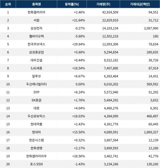 한편 거래량 상위 20위권 종목들은 DYP(092780) ▲8.24%, SK증권(001510) ▲1.76%, 대창(012800) ▲4.04%, 두산로보틱스(454910) ▲18.03%, 현대약품(004310) ▲2.43%, 현대차(005380) ▲15.50%, 한온시스템(018880) ▲0.32%, 한화생명(088350) ▲2.17%, 한화갤러리아우(45226K) ▲28.56%, 포스코DX(022100) ▼1.43% 등의 성적을 기록한다.