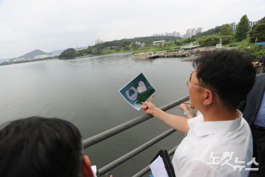 의암호 인공수초섬 사고 현장 검증을 실시 중인 춘천지법 재판부. 구본호 기자 |