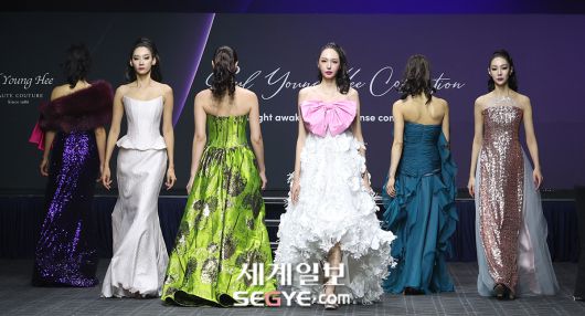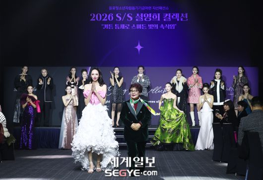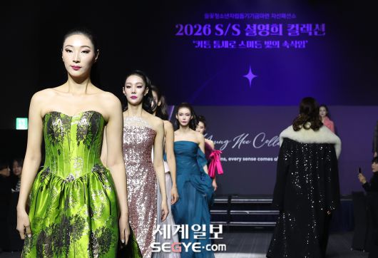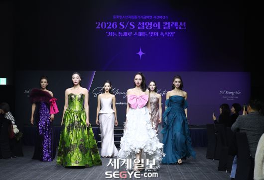 들꽃청소년 자립돕기 기금 마련을 위한 설영희 디자이너의 2026 S/S 자선 패션쇼가 19일 서울 용산구 그랜드하얏트호텔에서 열렸다. 모델들이 런웨이에서 의상을 선보이고 있다.