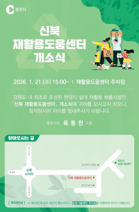 춘천시는 오는 21일 오후 3시 신북읍 산천리 신북 재활용도움센터에서 개소식을 열고 시민 중심의 자원순환 체계 구축에 나선다. 이날 개소식에는 육동한 춘천시장과 김진호 춘천시의회 의장 등 주요 내빈이 참석해 지속 가능한 자원순환 정책에 대한 의지를 공유한다.