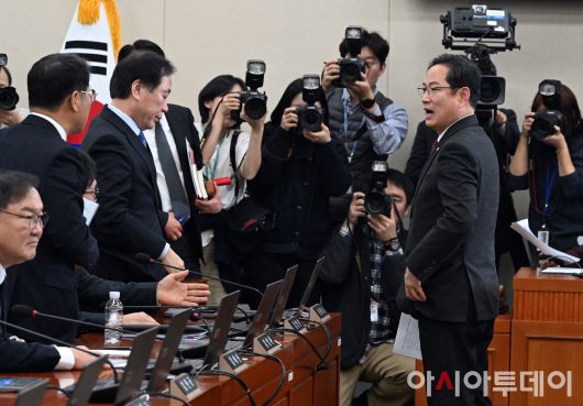 아시아투데이 송의주 기자 = 19일 국회 재정경제기획위원회에서 열린 이혜훈 기획예산처 장관 후보자 인사청문회가 여야 공방 끝에 정회된 가운데 더불어민주당 정태호 간사와 국민의힘 박수영 간사가 논의를 하고 있다. ⓒ "젊은 파워, 모바일 넘버원 아시아투데이"