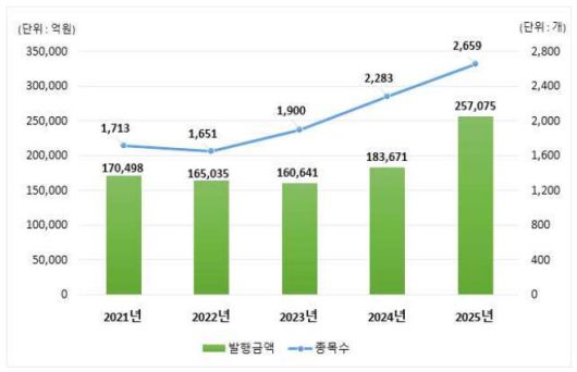 발행 구조를 보면 사모 발행 비중이 높았다. 2025년 공모 발행금액은 6조 8562억원(26.7%)으로 전년 대비 4.9% 감소한 반면, 사모 발행금액은 18조 8513억원(73.3%)으로 68.9% 급증했다.