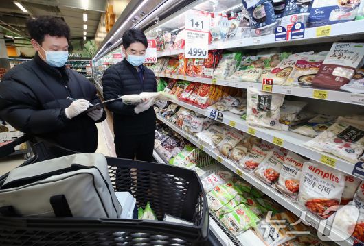 (대구=뉴스1) 공정식 기자 = 19일 오후 대구의 한 대형마트에서 대구시 관계자들이 설 명절을 앞두고 성수식품에 대한 위생을 점검하고 있다. 대구시는 설 명절을 앞두고 오는 23일까지 9개 구·군, 소비자식품위생감시원과 합동으로 식품 제조·가공업소, 유통·판매업소, 건강기능식품 판매업소 등 총 166개소를 대상으로 성수식품과 축산물을 집중적으로 점검한다. 2026.1.19/뉴스1