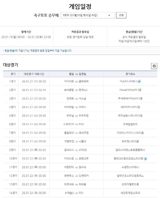 한편, 축구토토 승무패 5회차는 1월 19일 오전 8시부터 20일 오후 11시까지 발매가 진행된다.