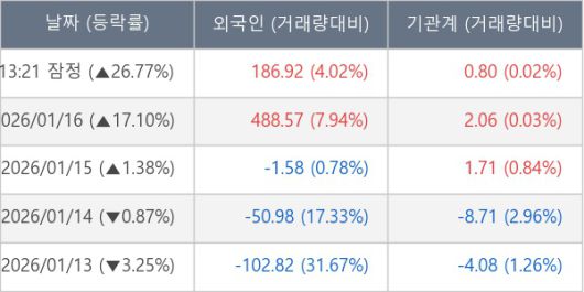 [서울=뉴스핌] 로보뉴스 = 19일 13시 30분 현재 우리기술(032820)은 외국인과 기관이 각각 186.92 만 주, 0.80 만 주 순매수(잠정) 하면서 전일 대비 26.77% (현재가 5,990원) 상승하고 있다.