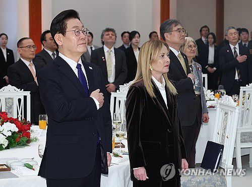 (서울=연합뉴스) 한상균 기자 = 이재명 대통령이 19일 청와대에서 열린 조르자 멜로니 이탈리아 총리와의 공식 오찬에서 국기에 경례하고 있다. 2026.1.19