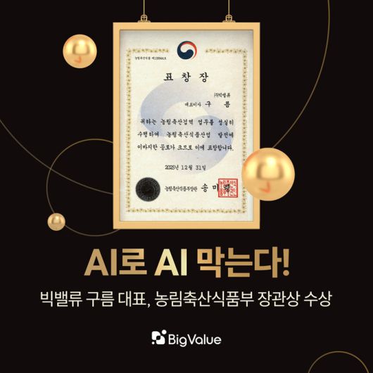빅밸류가 가축 전염병 위험도 예측 인공지능(AI) 모델 구축 공로를 인정받아 구름 공동대표가 농림축산식품부 장관 표창을 수상했다고 19일 밝혔다.