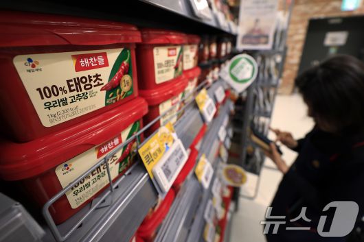 (서울=뉴스1) 박정호 기자 = 19일 서울 시내의 한 대형마트에서 직원이 진열된 고추장 재고를 확인하고 있다. 한국소비자단체협의회 물가감시센터는 이날 2025년 4분기 생활필수품 가격조사 분석 결과 39개 품목 중 28개 품목의 가격이 전년 동기 대비 상승했으며, 11개 품목은 하락했다고 밝혔다. 이중 커피믹스 품목(180개입 환산)는 2024년 4분기 평균 27,683원에서 2025년 4분기 평균 32,262원으로 16.5% 상승했으며, 필수 식재료에서는 고추장(10.9%)과 달걀(8.9%) 등이 역시 상승했다. 2026.1.19/뉴스1