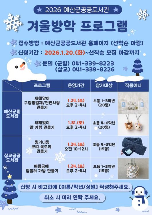 2026년 예산군 공공도서관 겨울방학 프로그램 운영 안내문 |