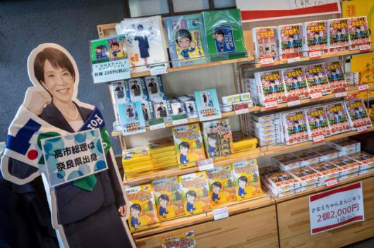 다카이치 사나에 일본 총리의 고향인 나라시의 한 기념품 가게에서 다카이치 총리를 주제로 한 기념품이 전시되어 있다.[사진=AFP연합뉴스] |