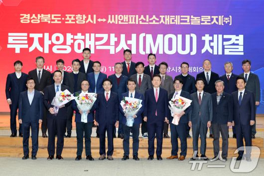 (포항=뉴스1) 최창호 기자 = 이철우 경북지사와 이강덕 시장, 김일만 포항시의장 등 참석자들이 19일 포항시청 대회의실에서 열린 씨앤피신소재테크놀로지㈜와 5000억 원 규모의 투자 양해각서 체결을 한 후 기념촬영을 하고 있다. 2026.1.19/뉴스1choi119@news1.krCopyright ⓒ 뉴스1. All rights reserved. 무단 전재 및 재배포, AI학습 이용 금지.