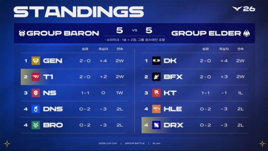 그룹 대항전으로 진행되는 LCK컵 1주 차는 바론 그룹과 장로 그룹 모두 상위권이 빠르게 형성되며 초반 판도가 드러났다.