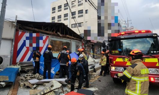 10일 오후 경기 의정부시 호원동의 한 거리를 걷던 20대 남성 ㄱ씨가 강풍을 견디지 못하고 떨어진 간판과 건물 외벽 잔해에 깔려 숨졌다. 소방당국이 사고 현장을 수습하고 있다. 경기도북부소방재난본부 제공 |