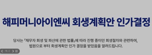 19일 법조계에 따르면, 서울회생법원 제4부(재판장 정준영)는 지난 9일 주식회사 해피머니아이엔씨의 청산형 회생계획안을 인가했다.