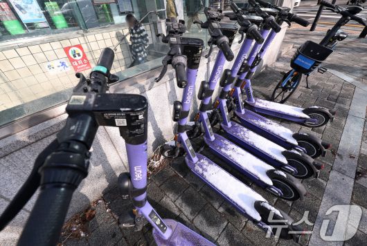 (서울=뉴스1) 구윤성 기자 = 19일 서울 서대문구 신촌역 인근에 전동킥보드가 세워져 있다. 서울시에 따르면 전동킥보드를 대여할 때 운전면허증 확인을 의무화하는 내용의 ‘개인형 이동장치 이용 안전 증진 조례 일부개정조례안’을 입법 예고하고 시민 의견 수렴 절차를 진행중이다. 2026.1.19/뉴스1