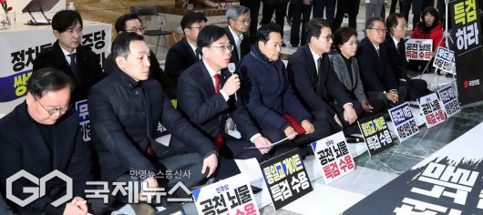 (서울=국제뉴스) 송언석 국민의힘 원내대표가 19일 서울 여의도 국회 로텐더홀에서 열린 최고위원회의에서 발언하고 있다./사진=이용우 기자
