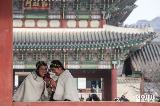 19일 오후 서울 종로구 경복궁을 한복을 입고 방문한 외국인 관람객들이 사진촬영을 하며 시간을 보내고 있다.