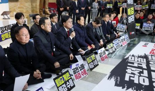 송언석 국민의힘 원내대표가 19일 국회 로텐더홀 농성장에서 열린 최고위원회의에서 발언하고 있다. <ⓒ투자가를 위한 경제콘텐츠 플랫폼, 아시아경제(www.asiae.co.kr) 무단전재 배포금지>