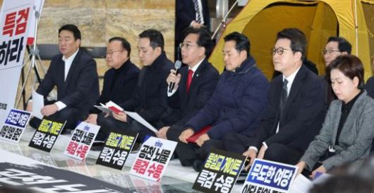 송언석 국민의힘 원내대표가 19일 국회 로텐더홀 농성장에서 열린 최고위원회의에서 발언하고 있다. <ⓒ투자가를 위한 경제콘텐츠 플랫폼, 아시아경제(www.asiae.co.kr) 무단전재 배포금지>