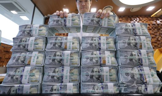 (서울=뉴스1) 김성진 기자 = 환리스크에 노출된 우리나라의 달러자산 규모가 외환시장 규모의 25배에 달한다는 국제통화기금(IMF)의 경고가 나왔다. 18일 IMF가 발간한 '글로벌 금융안정보고서(Global Financial Stability Report)'에 따르면, 우리나라의 환노출 달러자산 규모는 외환시장 거래량(월간 기준)의 약 25배에 달했다. 해당 지표는 각국 외환시장이 환율 변동 충격을 얼마나 흡수할 수 있는지를 가늠하는 척도로 활용된다. 사진은 19일 서울 중구 하나은행 위변조대응센터에서 직원이 달러화를 정리하는 모습. 2026.1.19/뉴스1