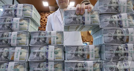 (서울=뉴스1) 김성진 기자 = 환리스크에 노출된 우리나라의 달러자산 규모가 외환시장 규모의 25배에 달한다는 국제통화기금(IMF)의 경고가 나왔다. 18일 IMF가 발간한 '글로벌 금융안정보고서(Global Financial Stability Report)'에 따르면, 우리나라의 환노출 달러자산 규모는 외환시장 거래량(월간 기준)의 약 25배에 달했다. 해당 지표는 각국 외환시장이 환율 변동 충격을 얼마나 흡수할 수 있는지를 가늠하는 척도로 활용된다. 사진은 19일 서울 중구 하나은행 위변조대응센터에서 직원이 달러화를 정리하는 모습. 2026.1.19/뉴스1