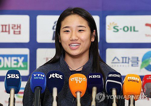 (영종도=연합뉴스) 김주형 기자 = 한국 배드민턴 간판 안세영이 19일 인도 뉴델리에서 열린 세계배드민턴연맹(BWF) 월드투어 슈퍼 750 인도오픈 경기를 마치고 귀국해 취재진의 질문에 답변하고 있다. 안세영은 지난해에 이어 이 대회 2연패를 달성했다. 2026.1.19