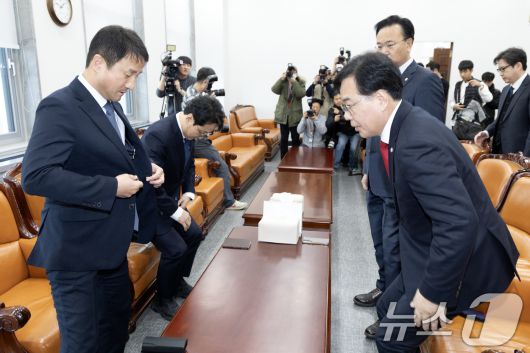 (서울=뉴스1) 이승배 기자 = 19일 서울 여의도 국회에서 한병도 더불어민주당 원내대표, 천준호 원내수석, 송언석 국민의힘 원내대표, 유상범 원내수석이 회동하고 있다. 2026.1.19/뉴스1
