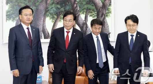 (서울=뉴스1) 이승배 기자 = 19일 서울 여의도 국회에서 한병도 더불어민주당 원내대표, 천준호 원내수석, 송언석 국민의힘 원내대표, 유상범 원내수석이 회동하고 있다. 2026.1.19/뉴스1photolee@news1.krCopyright ⓒ 뉴스1. All rights reserved. 무단 전재 및 재배포, AI학습 이용 금지.