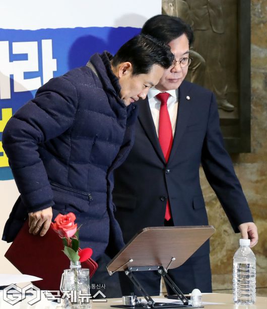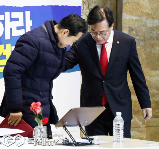 (서울=국제뉴스) 장동혁 국민의힘 대표와 송언석 원내대표가 19일 서울 여의도 국회 로텐더홀에서 열린 최고위원회의에 참석하고 있다./사진=이용우 기자