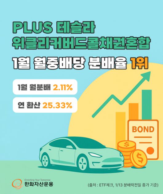한화자산운용은 ‘PLUS 테슬라위클리커버드콜채권혼합 상장지수펀드(ETF)가 1월 분배금으로 주당 212원을 지급한다고 19일 밝혔다.