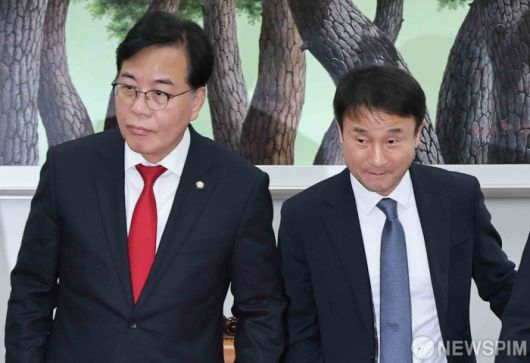 [서울=뉴스핌] 윤창빈 기자 = 한병도 더불어민주당 원내대표, 송언석 국민의힘 원내대표가 19일 서울 여의도 국회에서 회동에 앞서 기념촬영을 마치고 자리로 향하고 있다. 2026.01.19 pangbin@newspim.com