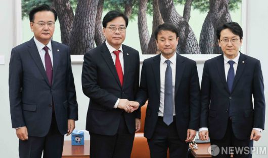 [서울=뉴스핌] 윤창빈 기자 = 한병도 더불어민주당 원내대표, 송언석 국민의힘 원내대표가 19일 서울 여의도 국회에서 회동에 앞서 기념촬영을 하고 있다. 왼쪽부터 유상범 국민의힘 원내수석부대표, 송 원내대표, 한 원내대표, 천준호 더불어민주당 원내운영수석부대표. 2026.01.19 pangbin@newspim.com
