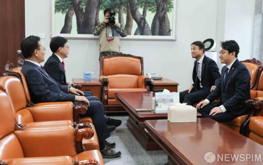 [서울=뉴스핌] 윤창빈 기자 = 한병도 더불어민주당 원내대표, 천준호 원내운영수석부대표, 송언석 국민의힘 원내대표, 유상범 원내수석부대표가 19일 서울 여의도 국회에서 여야 원내대표 회동을 하고 있다. 2026.01.19 pangbin@newspim.com