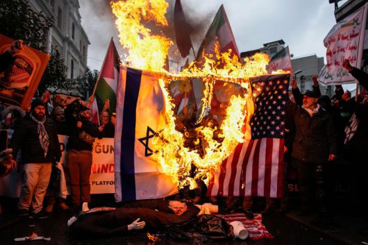 [이스탄불=AP/뉴시스] 18일(현지 시간) 튀르키예 이스탄불에서 이란 정부를 지지하는 시위대가 미국과 이스라엘 국기를 불태우고 있다. 2026.01.19. [사진 영상 제보받습니다] 공감언론 뉴시스가 독자 여러분의 소중한 제보를 기다립니다. 뉴스 가치나 화제성이 있다고 판단되는 사진 또는 영상을 뉴시스 사진영상부(n-photo@newsis.com)로 보내주시면 적극 반영하겠습니다.