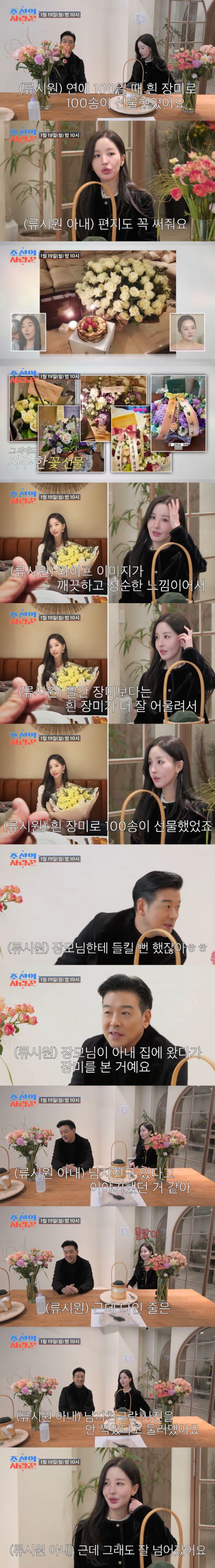류시원은 "연애 100일 때 흰 장미로 100송이 선물했었다"며 "아내 이미지가 깨끗하고 청순한 느낌이어서 빨간 장미보다는 흰 장미가 더 잘 어울려서 흰 장미로 100송이 선물 했었다"라고 말해 눈길을 끌었다.