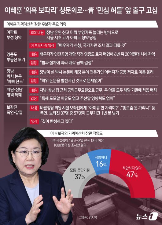 (서울=뉴스1) 김지영 디자이너 = 정치권에 따르면 19일 예정된 이 후보자에 대한 국회 인사청문회는 국민의힘 보이콧으로 파행이 불가피하다. 국민의힘은 핵심 검증자료들이 제출되지 않고 있어 청문회 진행이 불가능하다는 입장이다. 이 후보자는 국민의힘 전신인 한나라당·새누리당에서 3선 의원을 지낸 야권 인사다. 이 대통령의 깜짝 지명은 송미령 농림축산식품부 장관 유임에 이은 능력 중심 '통합 인선' 기조라는 평가가 나왔다. 그러나 계엄 옹호 발언, 보좌진 폭언·갑질, 부정 청약, 부동산 투기, 자녀 논문 의혹 등이 쏟아지며 여권 일각에서조차 불가 여론이 불거진 상황이다.