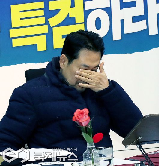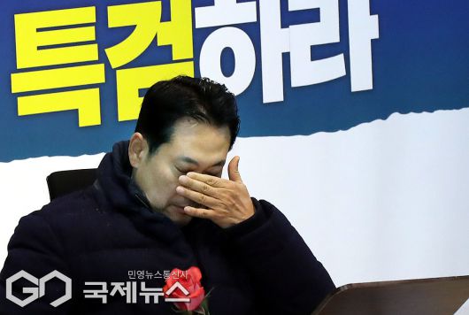 (서울=국제뉴스) 더불어민주당의 통일교 및 공천뇌물 특검 수용을 촉구하며 5일째 단식을 이어가고 있는 장동혁 국민의힘 대표가 19일 서울 여의도 국회 로텐더홀에서 피곤한듯 눈을 비비고 있다./사진=이용우 기자