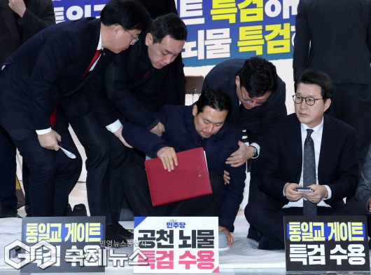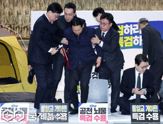 (서울=국제뉴스) 5일째 단식농성 중인 장동혁 국민의힘 대표가 19일 서울 여의도 국회 로텐더홀에서 열린 최고위원회의를 마치고 최고위원 등에게 부축을 받으며 일어나고 있다./사진=이용우 기자
