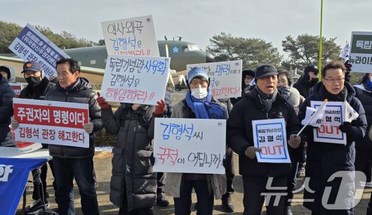 (천안=뉴스1) 이시우 = 독립기념관 이사회가 열린 19일 충남 천안 독립기념관 밝은누리관 앞에서 독립운동가 후손과 시민단체 회원들이 김형석 관장의 해임을 촉구 하고 있다 2026.1.19/뉴스1