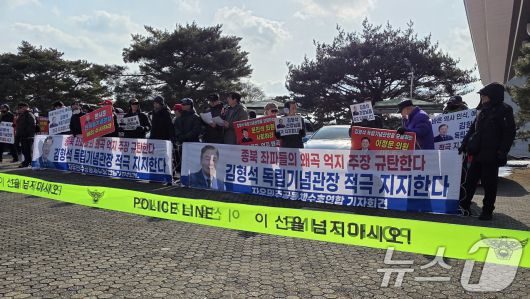 폴리스라인 설치된 김형석 관장 지지자 기자회견