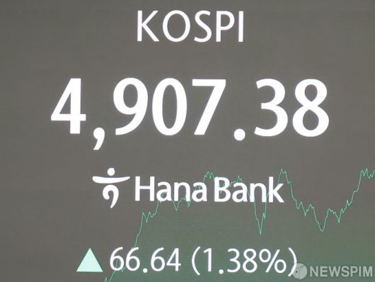 [서울=뉴스핌] 류기찬 기자 = 코스피가 장중 4900선을 돌파한 19일 오후 서울 중구 하나은행 딜링룸 전광판에 코스피 지수가 표시되고 있다. 2026.01.19 ryuchan0925@newspim.com