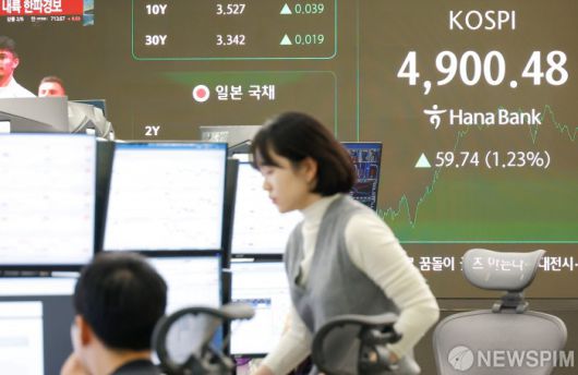 [서울=뉴스핌] 류기찬 기자 = 코스피가 장중 4900선을 돌파한 19일 오후 서울 중구 하나은행 딜링룸 전광판에 코스피 지수가 표시되고 있다. 2026.01.19 ryuchan0925@newspim.com